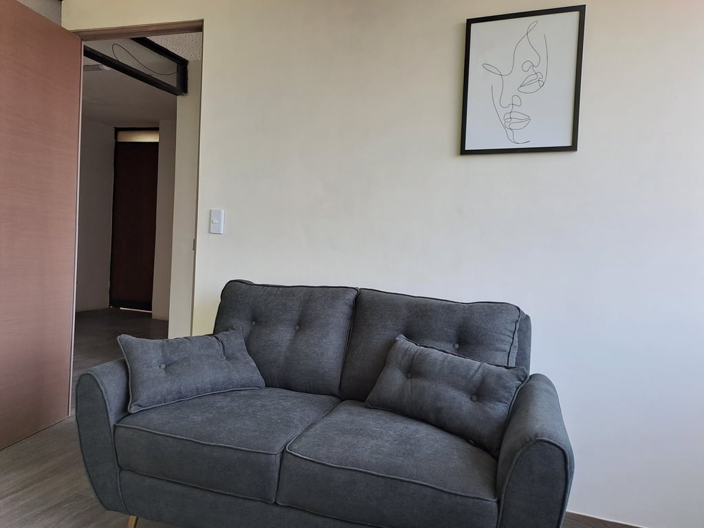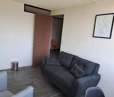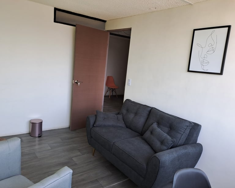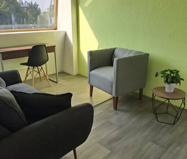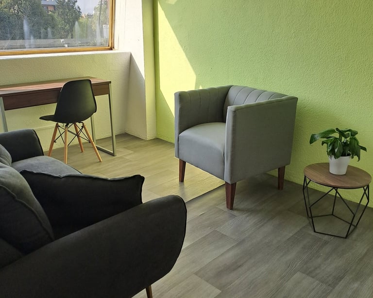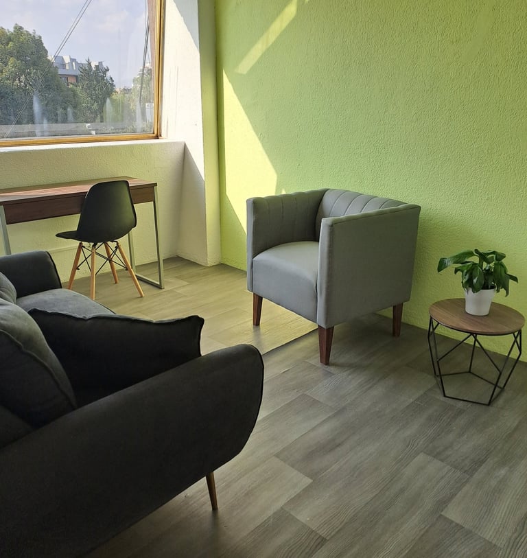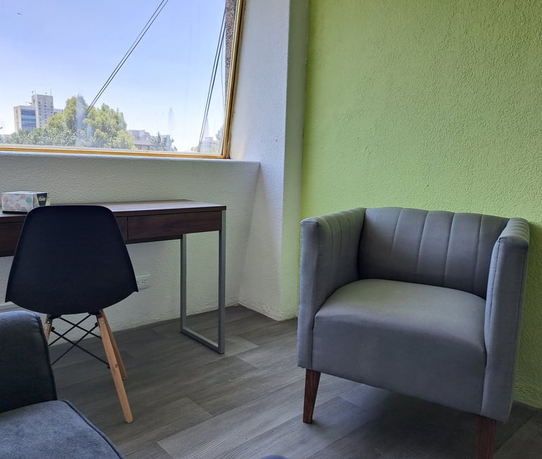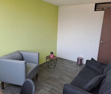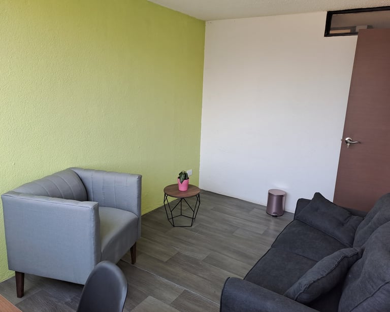 Consultorio equipado para brindar terapia individual, de pareja, familiar etc.; incluye aire acondicionado, escritorio y silla individual para realizar pruebas, sofá de 2 plazas para paciente y sofá de 1 plaza para terapeuta.