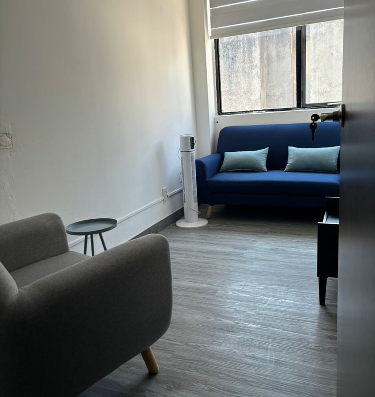 Excelente espacio para brindar atención individual, cuenta con sofá 1 plaza para terapeuta y sofá 2 plazas para paciente.